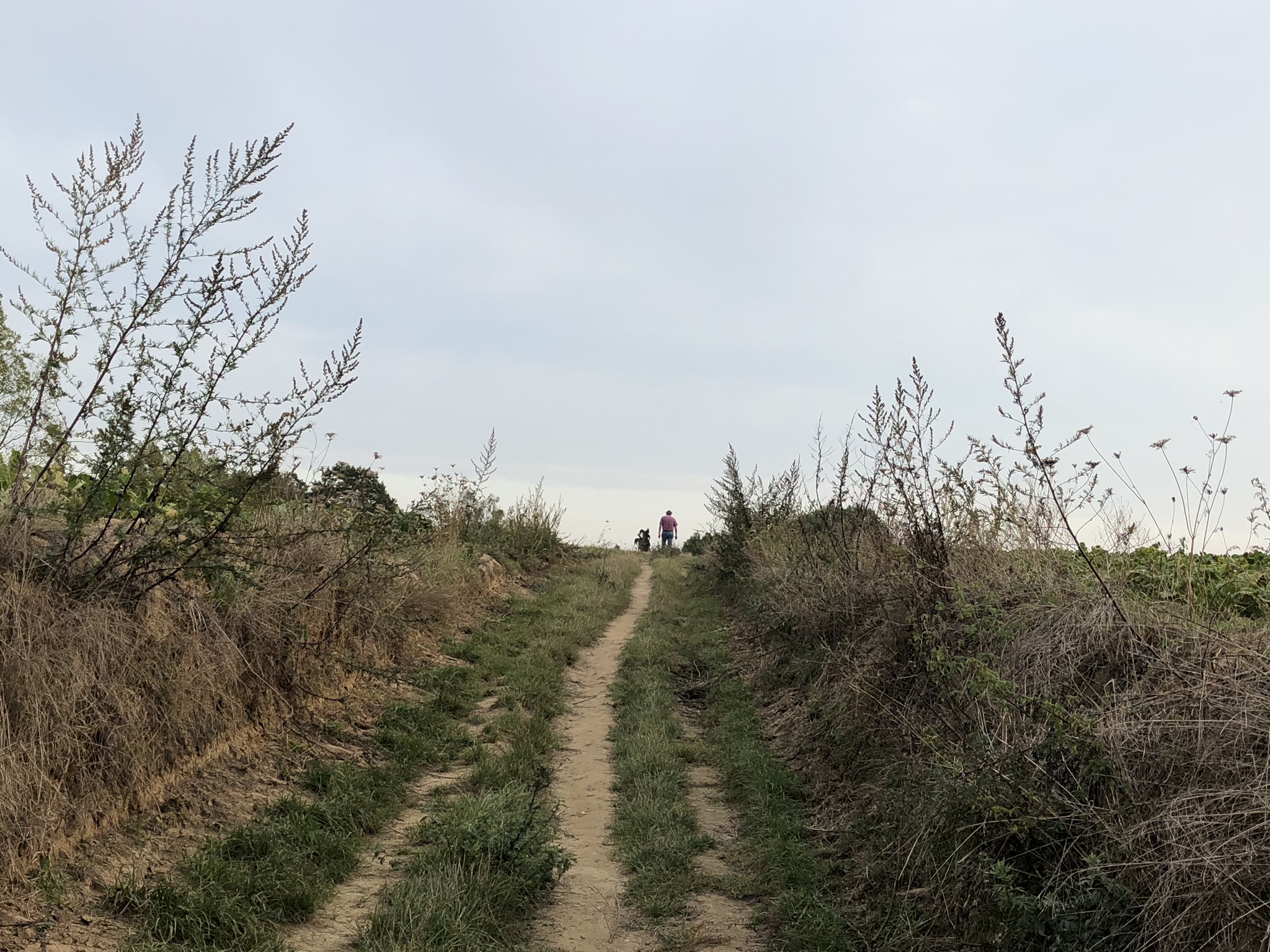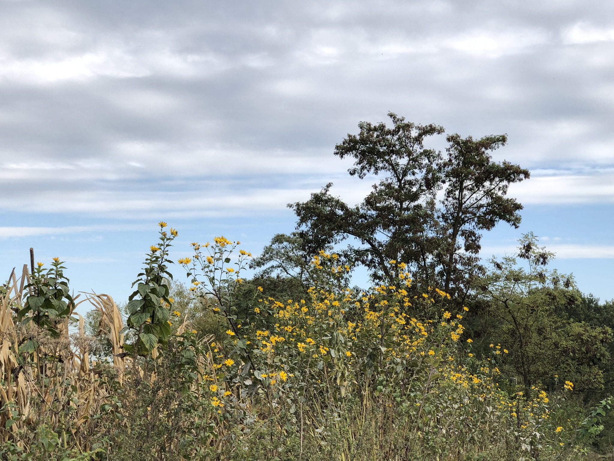 On a laissé la voiture sur le parking de la gare et on a remonté le Chemin de Bourgeois. A ma droite, le chemin est bordé par les hautes tiges des fleurs de topinambour. Leurs corolles jaunes illuminent le paysage. Je me retourne et je prends une photo à la dérobée.