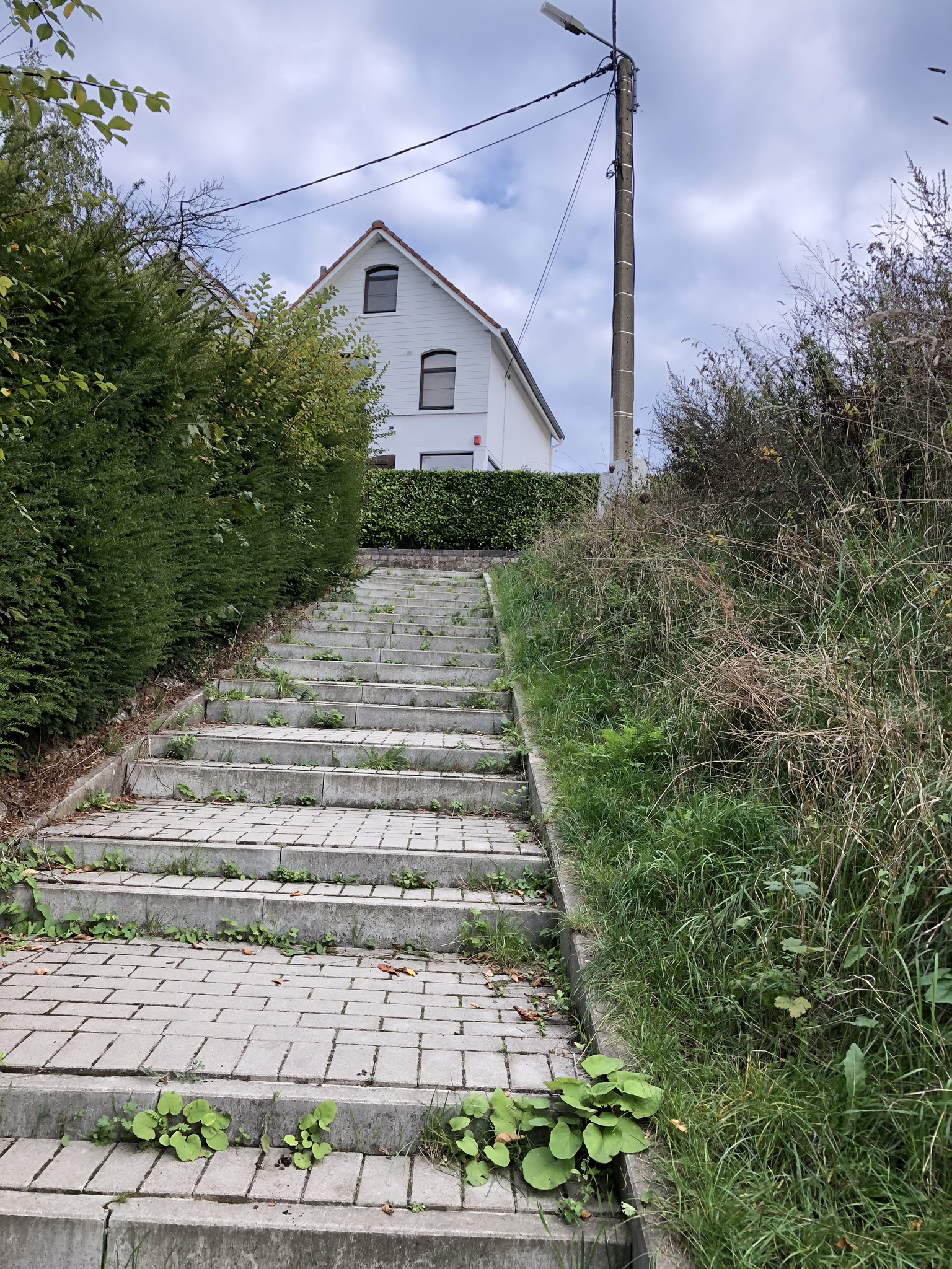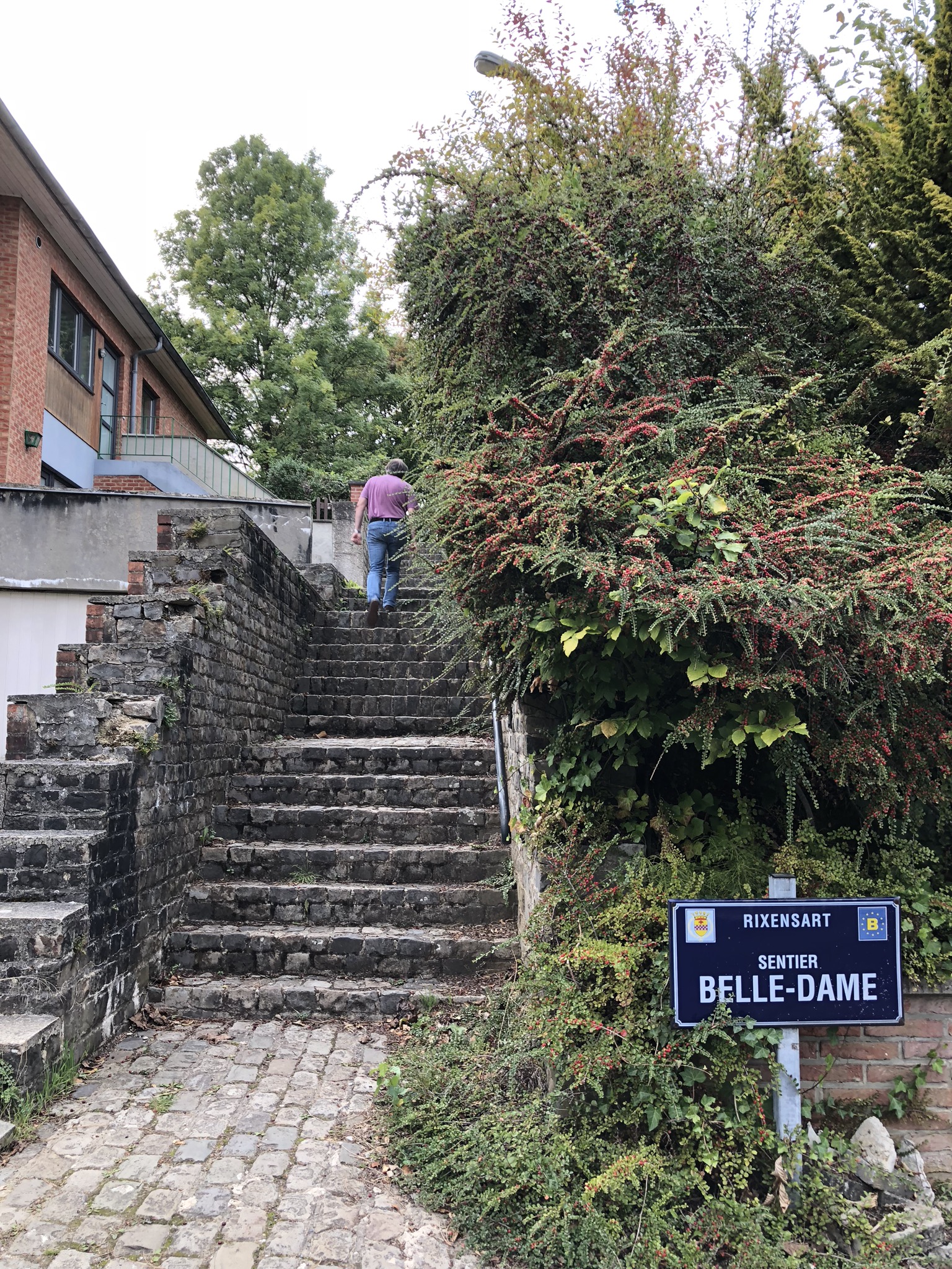 Après l’Avenue Paola, on passe par l’Avenue Marie Christine, l’Avenue Reine Elisabeth et il y a aussi une Avenue Reine Fabiola. Ici on monte un premier escalier puis un second.