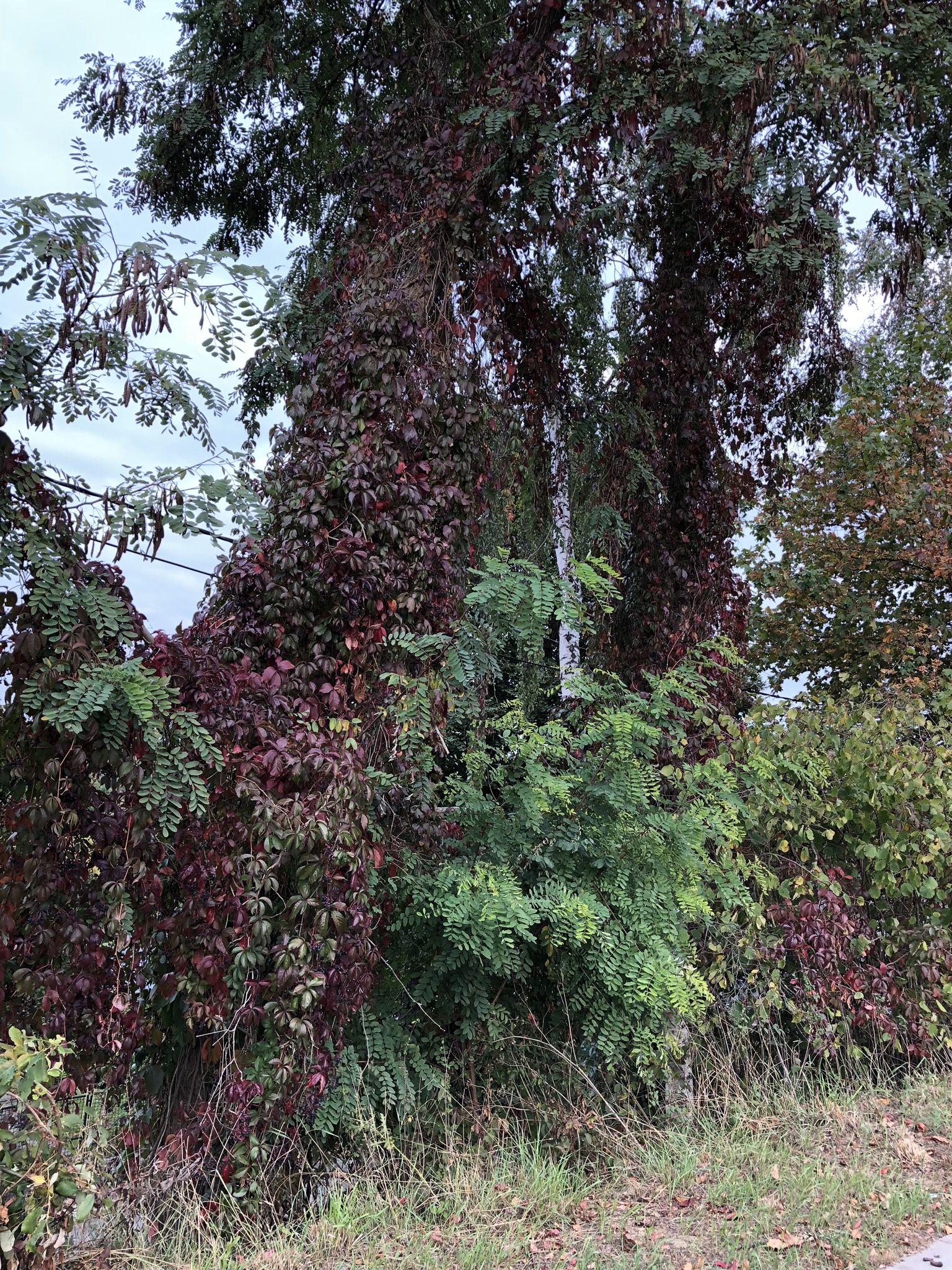 De la vigne vierge de Virginie (Parthenocissus quinquefolia) s’élance vers le ciel non loin de la Gare de Rixensart