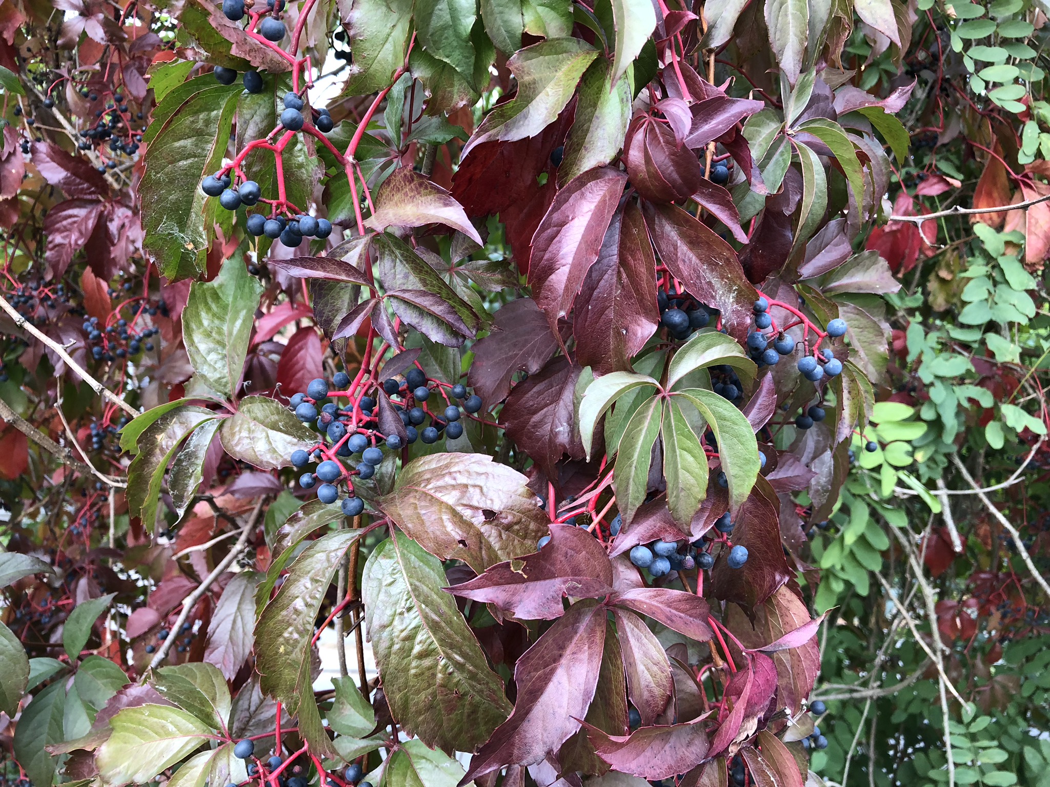 Parthenocissus quinquefolia: détail du feuillage virant au pourpre et de la fructification d’un beau bleu
