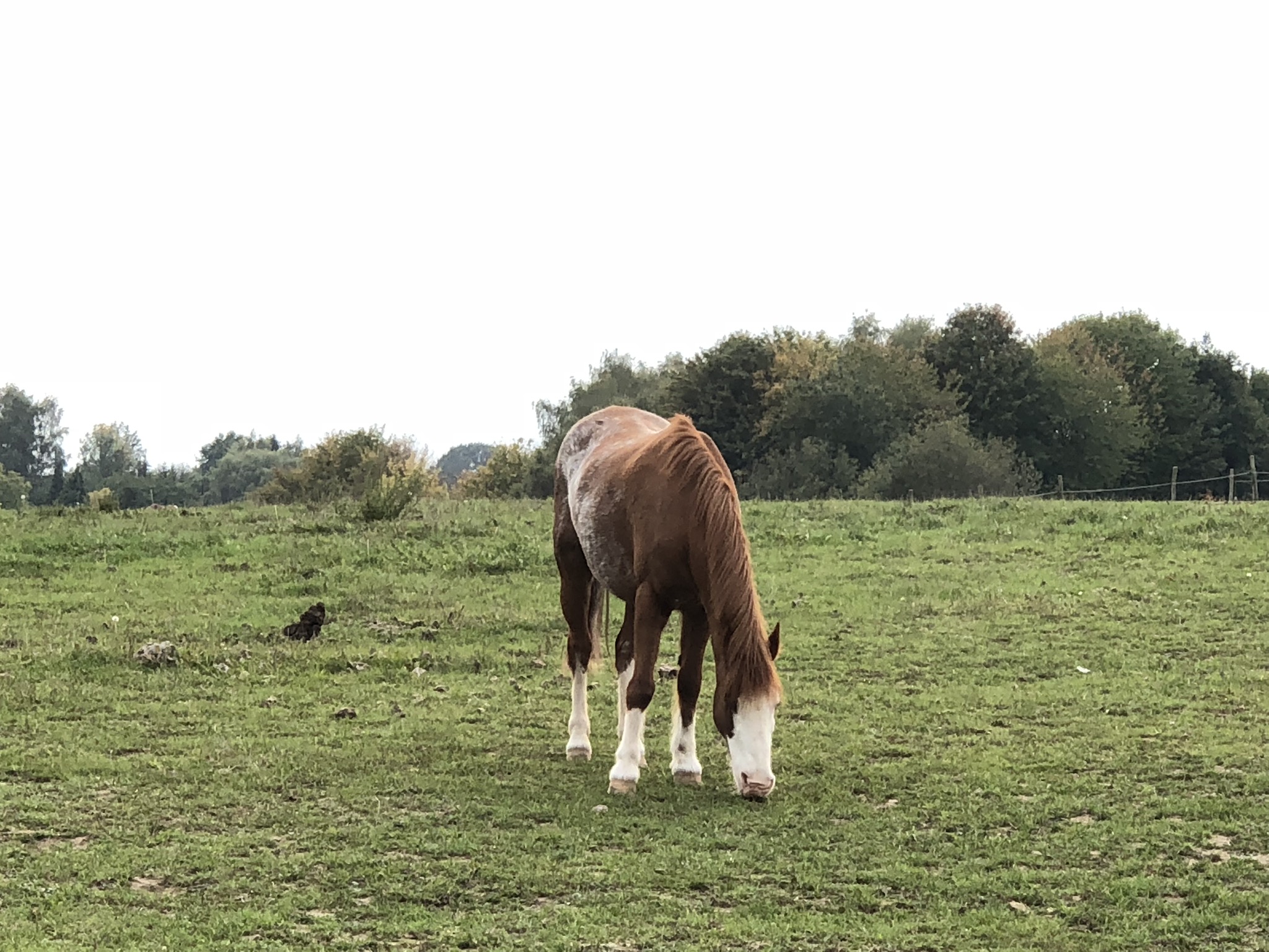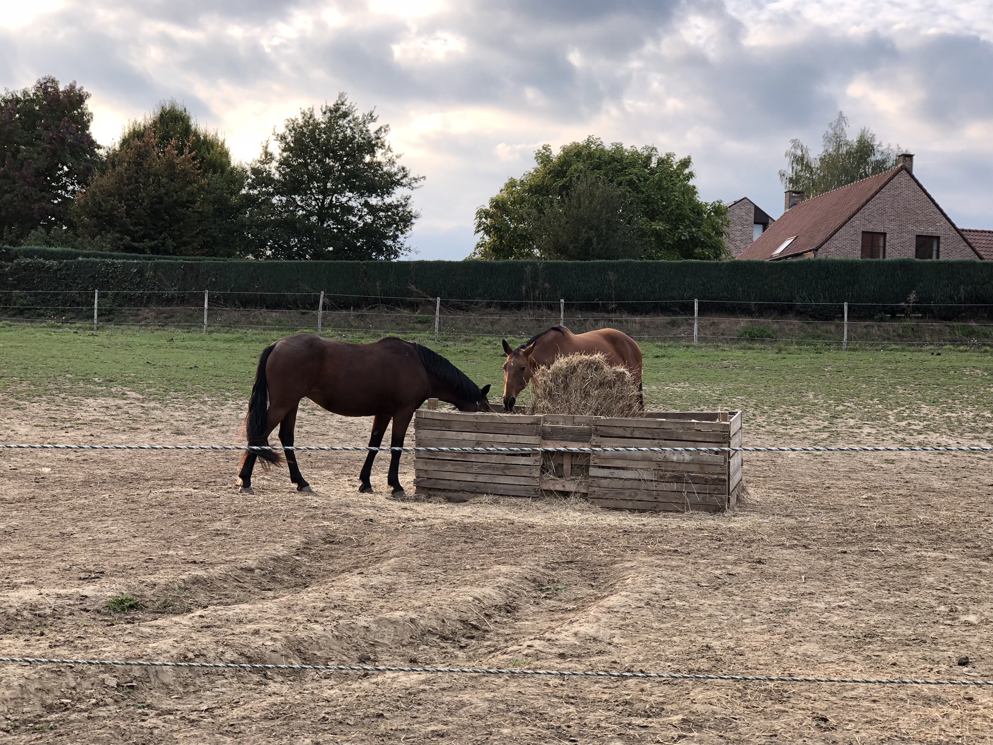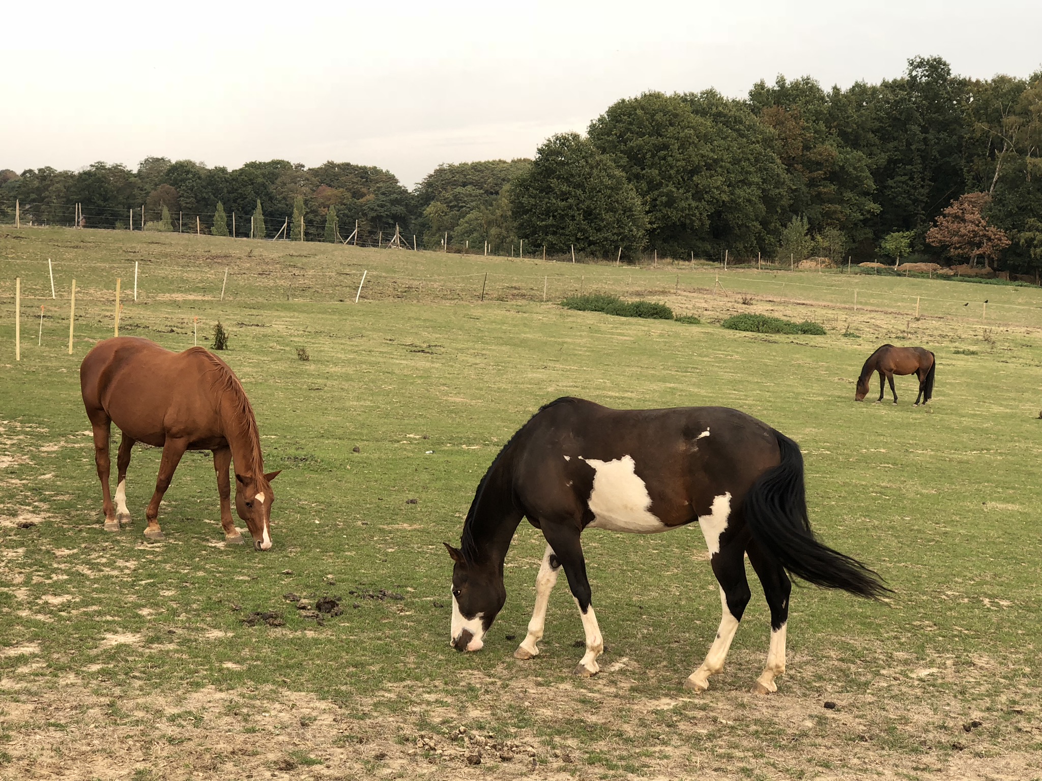 Plusieurs chevaux à droite et à gauche au delà des clôtures éléctriques. Les chevaux sont occupés à manger paisiblement
