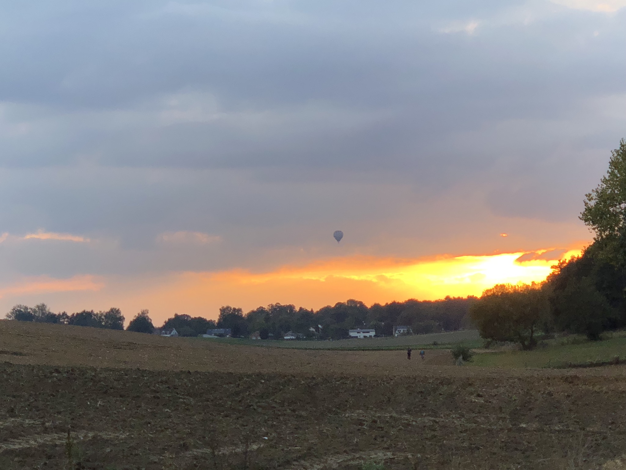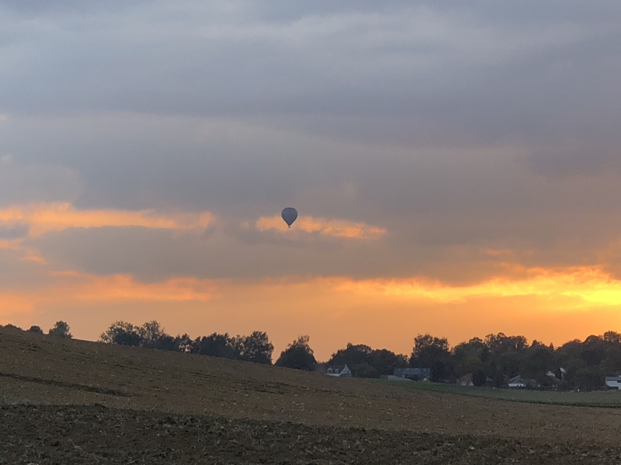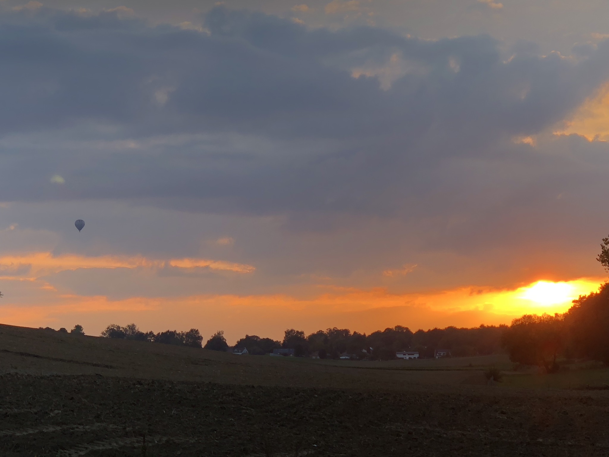 Dans l’embrasement du ciel au soleil couchant apparaît soudain une montgolfière. Dernières belles images de cette journée.